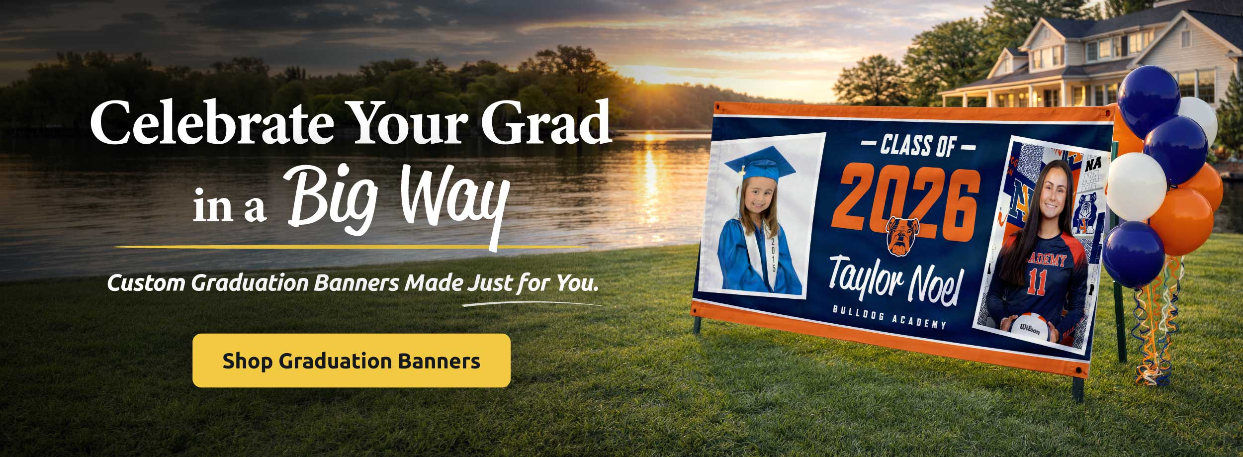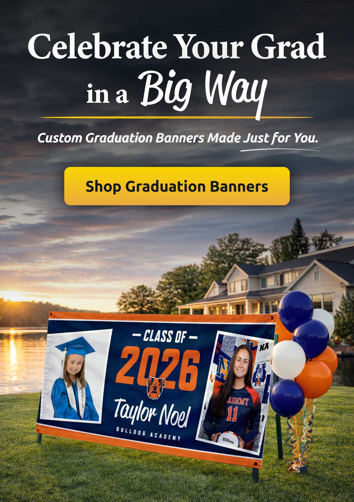 Celebrate big with custom vinyl banners and personalized event signs from Banneroo. We create graduation banners, birthday banners, sports banners, school banners, and business signage designed to make your moment stand out. Whether you need a photo banner for a front yard celebration or a bold custom sign for an event or promotion, Banneroo makes it easy to personalize your design and order with confidence.